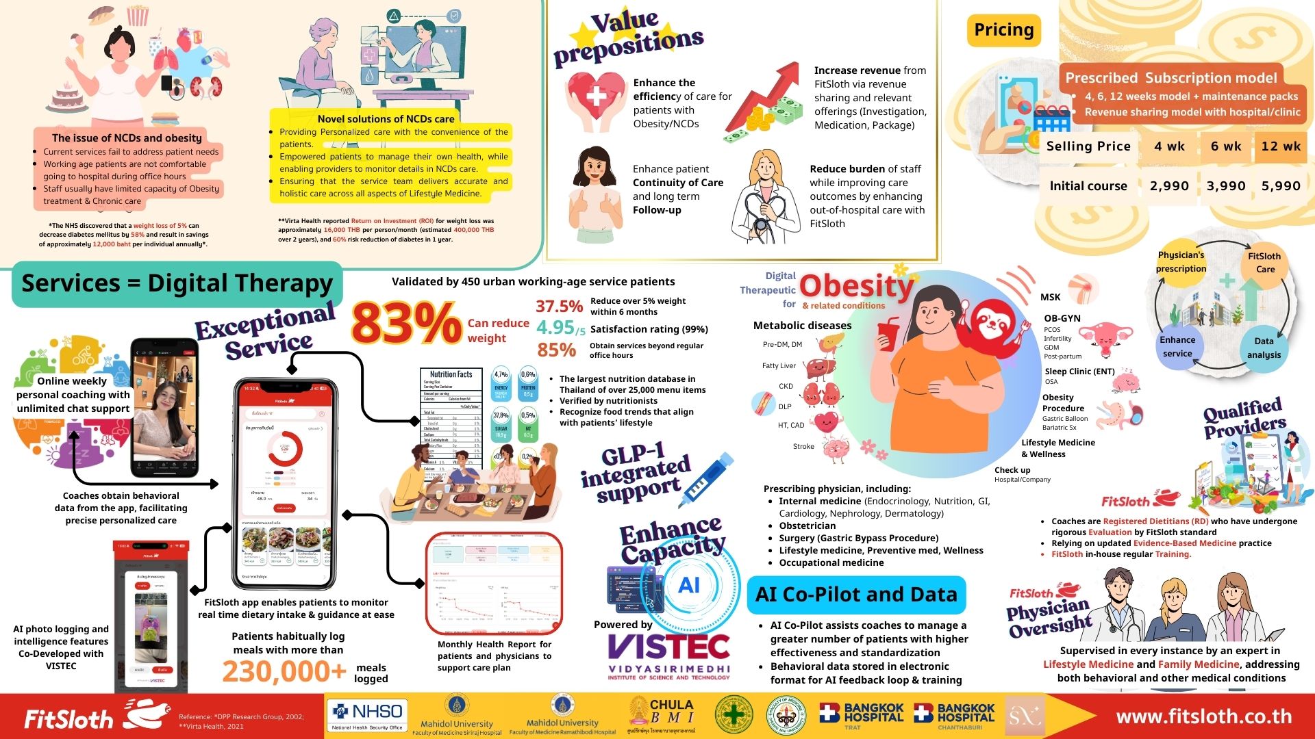 FitSloth is Thailands 1st prescribed, AI-powered Digital Therapeutic (DTx) for Obesity, clinically adopted by leading university, public, and private hospitals. Designed to integrate seamlessly into clinical workflows and GLP-1 therapy, FitSloth provides providers with a scalable, standardized model for delivering Lifestyle Medicine-based care with medical-grade precision