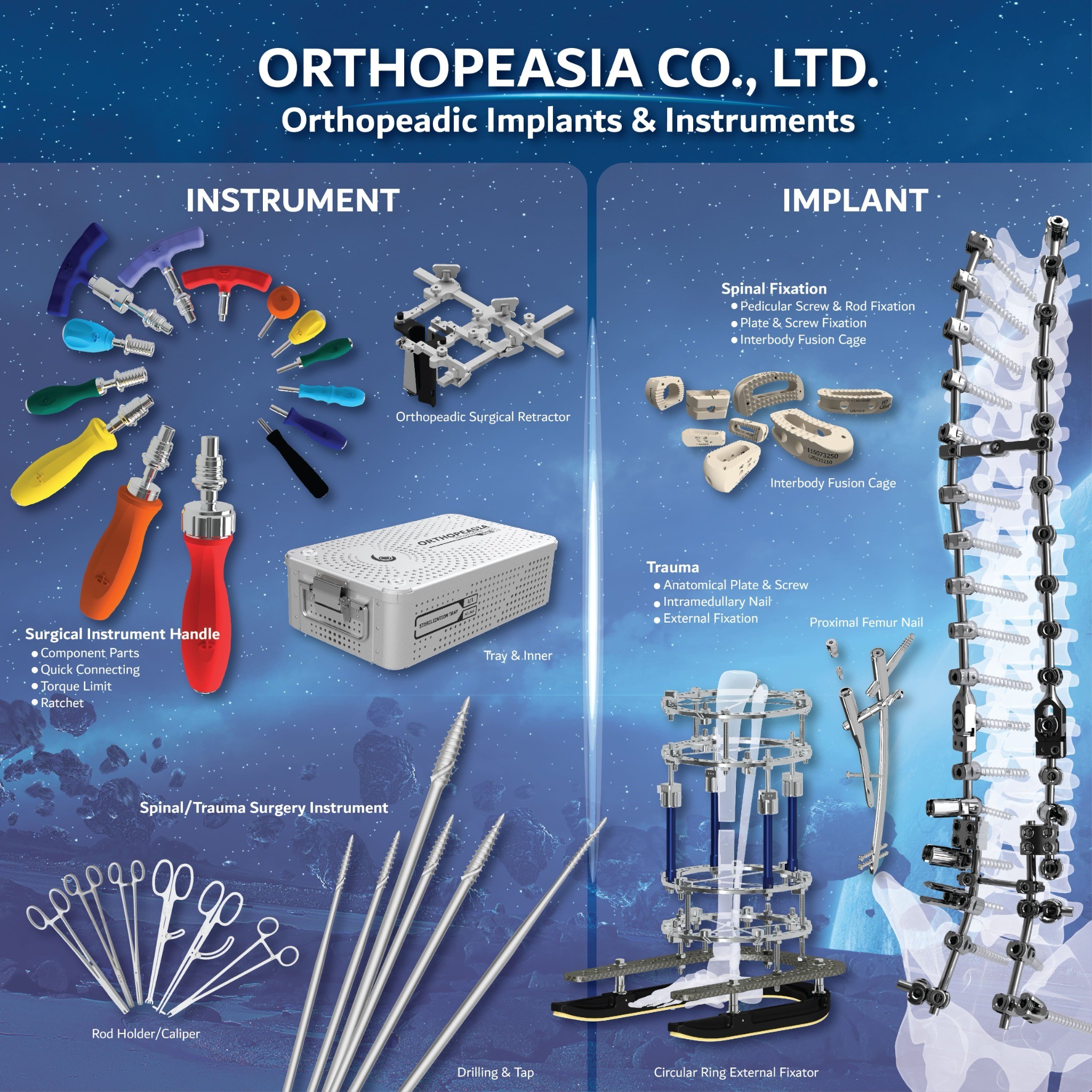 Orthopeasia specializes in manufacturing and distributing orthopedic implants and surgical instruments designed for precision and reliability. Our implant portfolio includes spinal fixation systems anterior and posterior cervical fixation, open and MIS thoracolumbar fixation, interbody fusion, and odontoid fixation as well as trauma solutions such as various types of nails, small and large fragment sets, and Move Free elbow hinge. We also provide high-quality surgical instruments, including retractor sets, spinal extractor sets, and spinal biopsy tools, along with veterinary vertebral fixation solutions for dogs, ensuring comprehensive support for both human and animal healthcare.