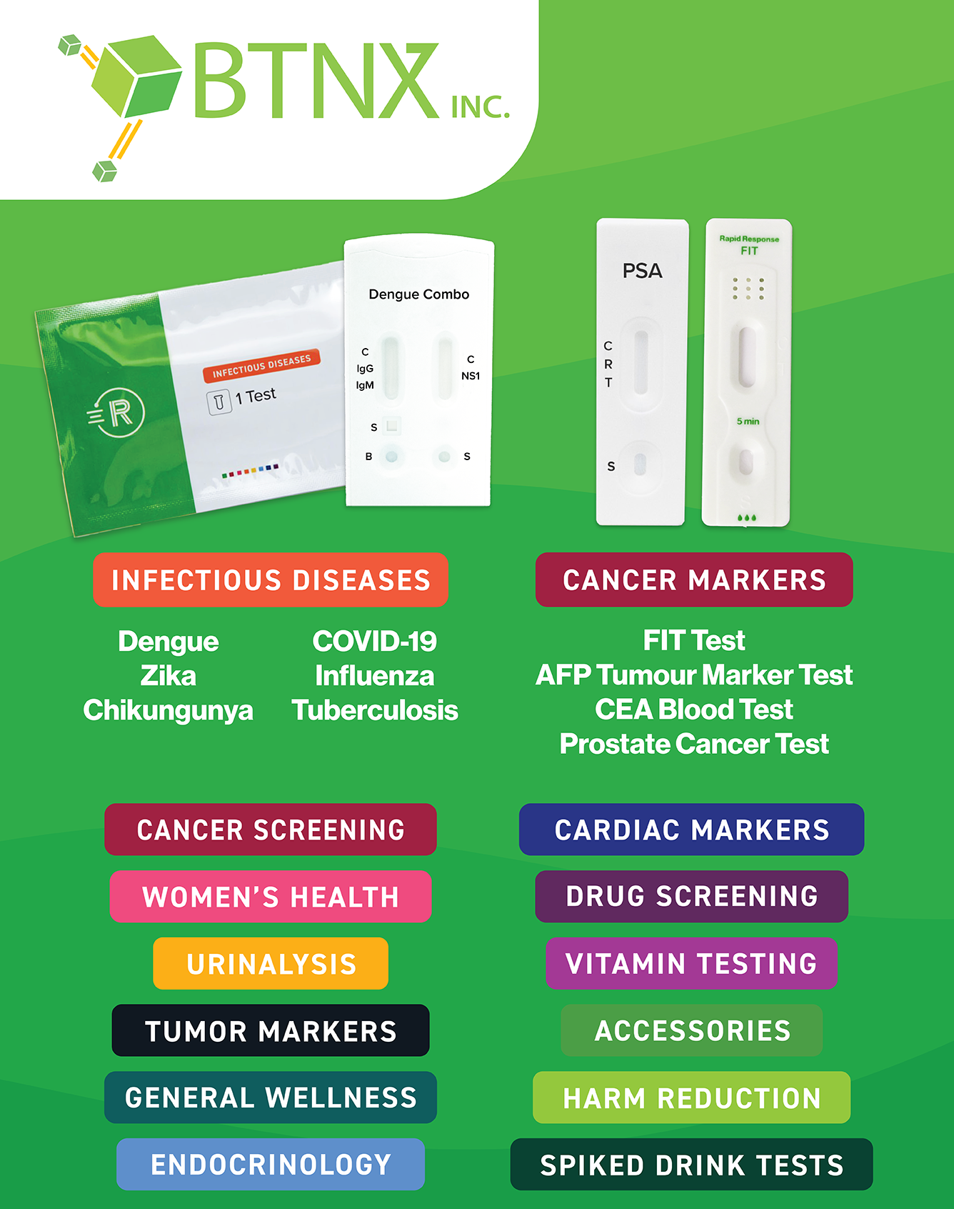 BTNX offers an extensive range of rapid tests including infectious diseases, cancer markers, women's health, general wellness, cardiac markers, urinalysis, vitamin testing, tumor markers, drug screening, endocrinology, harm reduction, spiked drink testing, and more. High quality products that are reliable, cost-effective, and easy to use, designed to deliver accurate results empowering healthcare professionals to provide their patients with timely and informed care. BTNX is a global leader delivering innovative testing solutions and technologies to meet modern demands.