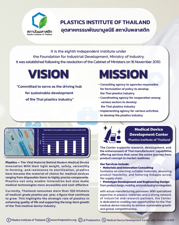 Medical Device Development Center Plastics Institute of Thailand The Center supports research, development, and the enhancement of Thai manufacturers capabilities, offering services that cover the entire journey from product concept to market readiness. Our Services include: Materials and Innovation Consulting Guidance on selecting suitable materials, assessing product feasibility, and fostering linkages across the supply chain. Prototype Development and Engineering Design From product design, molding, and prototyping to integration with actual manufacturing processes.