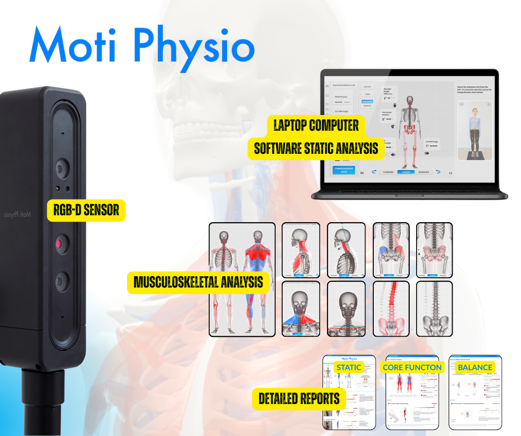 MOTI Physio Scanner An advanced posture and body assessment device that helps health professionals evaluate movement and alignment with precision. Using RGB-D camera technology and AI analysis, Moti measures spinal posture, body balance, and musculoskeletal deviations in just minutes providing clear, visual reports for both clinicians and patients. Launched in 2022, Moti has quickly become a trusted tool for physiotherapy clinics, spine centers, and wellness providers across Thailand. Its non-invasive, compact, and easy-to-use design makes it ideal for clinical assessments, corporate wellness programs, and fitness applications. With Moti, professionals can track patient progress, enhance treatment accuracy, and improve communication
